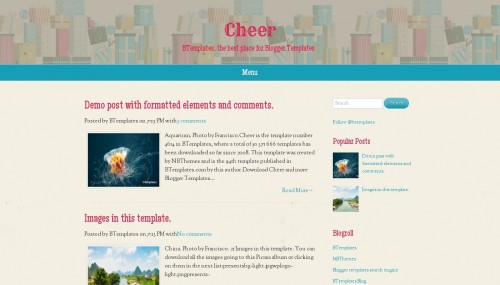 Cheer is a free blogger template adapted from WordPress with 2 columns, responsive design, seo friendly, right sidebar, posts thumbnails, a background pattern, related posts support and vintage style. Excellent template for blogs about books, christmas, family, fantasy or kids. Download Cheer for free in BTemplates.