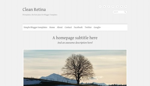 Clean Retina is a free blogger template adapted from WordPress with 2 columns, responsive design, right sidebar, minimalist, footer columns, slider, social bookmarking icons, posts thumbnails, a background pattern and neutral colors. Excellent template for blogs about crafts, to write a diary or home and decoration. Download Clean Retina for free in BTemplates.