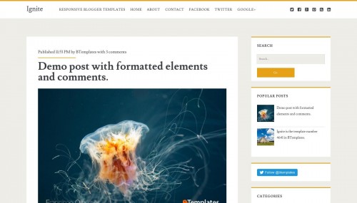 Ignite is a free blogger template adapted from WordPress with 2 columns, responsive design, seo friendly, right sidebar, social bookmarking icons and posts thumbnails. Excellent template for blogs about any general topic, to write a diary, photography, a personal portfolio site or travel. Download Ignite for free in BTemplates.