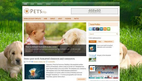 PetsWp is a free blogger template adapted from WordPress with 2 columns, responsive design, right sidebar, ads ready, footer columns, slider, social bookmarking icons, posts thumbnails, tabs, breadcrumbs, related posts support and cute design. Excellent template for blogs about animals, home and decoration, nature or people. Download PetsWp for free in BTemplates.