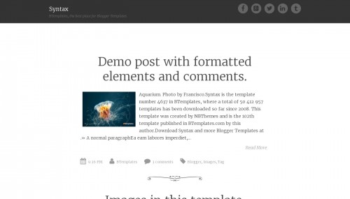 Syntax is a free blogger template adapted from WordPress with 1 column, responsive design, seo friendly, minimalist, footer columns, social bookmarking icons, posts thumbnails, tabs, simple look, neutral colors and vintage style. Excellent template for blogs about any general topic, to write a diary, fashion or photography. Download Syntax for free in BTemplates.